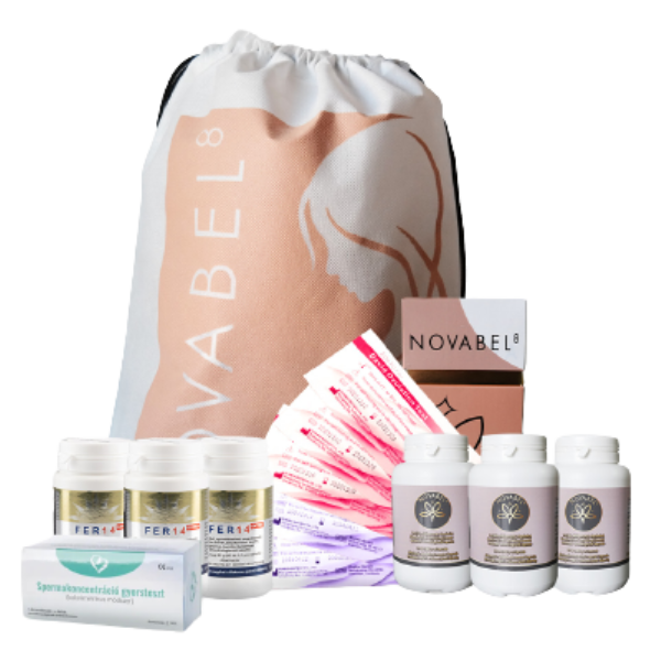 Pachetul de așteptare a bebelușului conține 3 cutii (90 buc/cutie) cu produse de sprijin pentru fertilitate Novabel8, 2 teste de sarcină Dávid și 3 teste de ovulație Dávid.